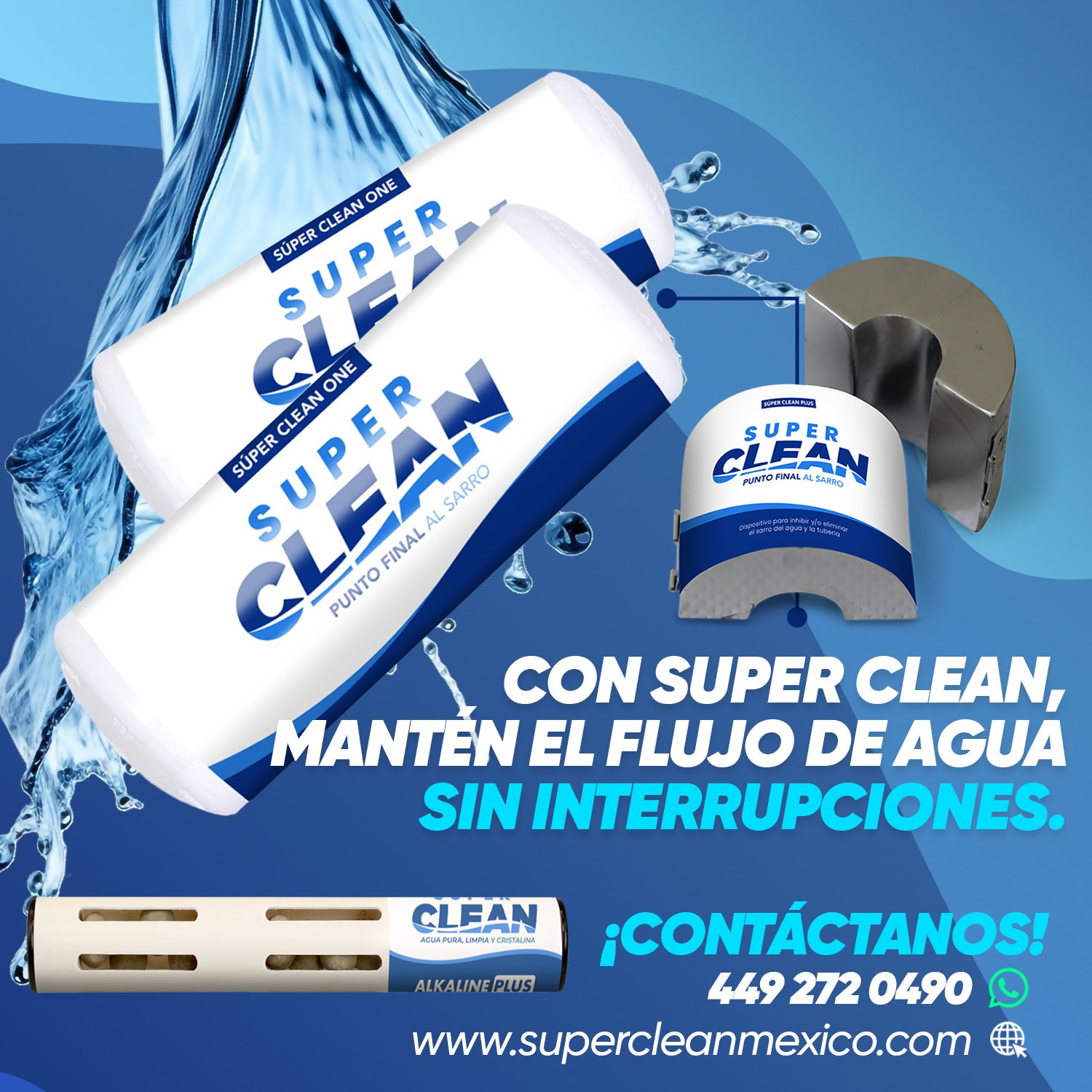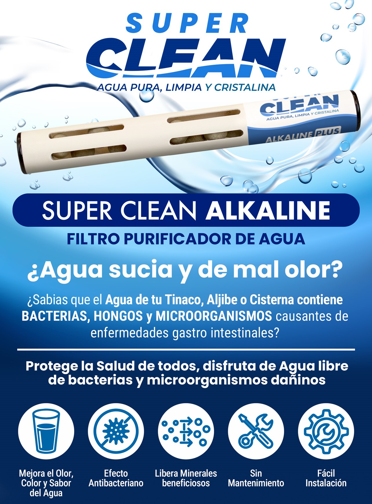 Super Clean ALKALINE PLUS transforma el agua almacenada en agua purificada más segura, limpia y confiable, sin químicos y sin complicaciones.