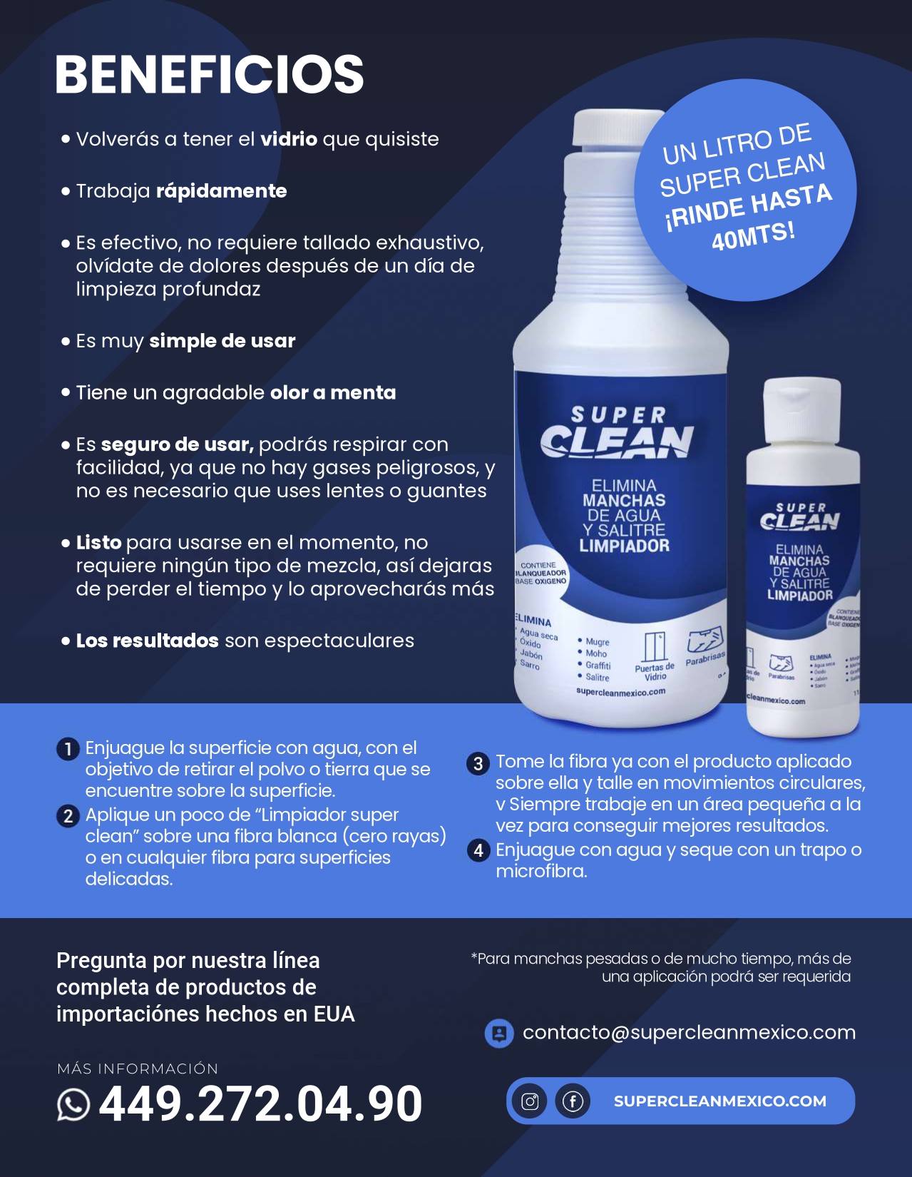 ¡Limpiador SUPER CLEAN! Limpia las áreas más difíciles en hogares, oficinas, hoteles, escuelas, guarderías, hospitales, clubs y más. Elimina años de esas molestas marcas de agua y manchas en puertas de baño, ventanas, cristales y más,